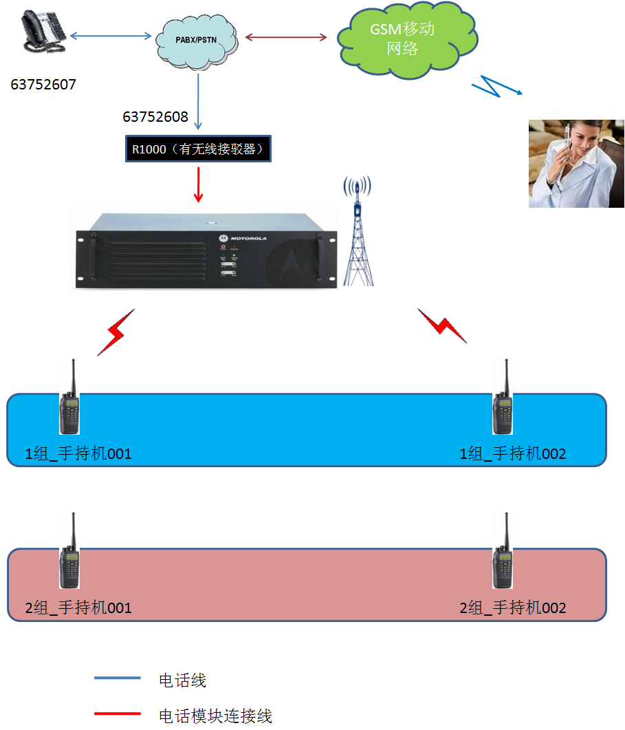 MOTOTRBO數(shù)字單中繼基站與有線電話系統(tǒng)組網(wǎng)示意圖