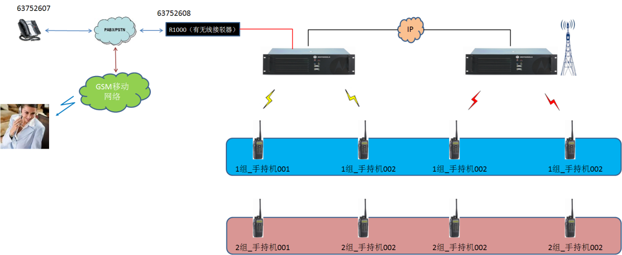 MOTOTRBO數(shù)字IP聯(lián)網(wǎng)同播系統(tǒng)與有線電話系統(tǒng)組網(wǎng)示意圖