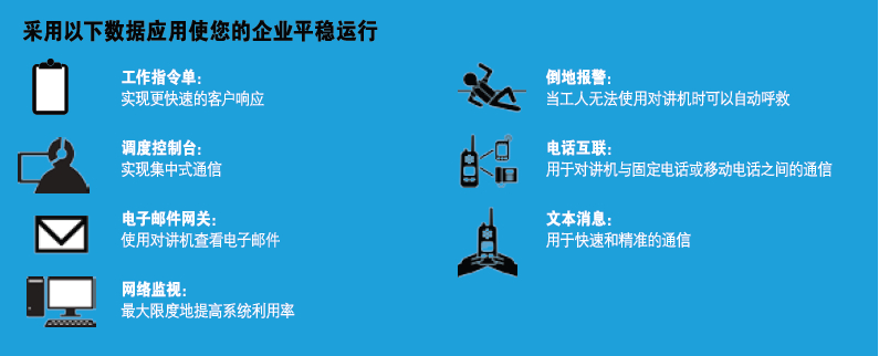 采用Linked Capacity Plus(多站點(diǎn)智能信道共享)可以使您管理移動工作隊伍變得前所未有的輕松、高效?,F(xiàn)在員工可以采用轉(zhuǎn)為企業(yè)而設(shè)計的集成式數(shù)據(jù)應(yīng)用來訪問實(shí)時信息。以往,例如進(jìn)行語音通信時,使用文本消息來共享信息并不方便,而且容易使人分心。而集成式GPS跟蹤和調(diào)度可以迅速定位和導(dǎo)航移動工作隊伍。數(shù)字電話在對講機(jī)和固定電話或手機(jī)之間實(shí)現(xiàn)無縫通信。