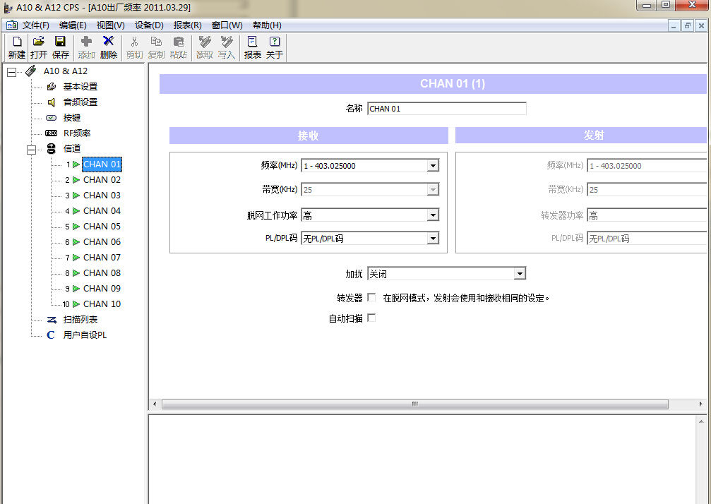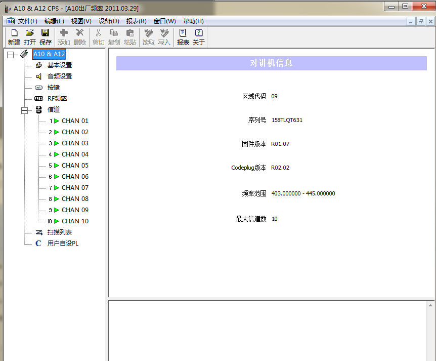 上圖底部區(qū)域我們可以看到寫頻線連接狀態(tài),目前顯示USB電纜未連接也就是說軟件沒有檢測到對講機。寫頻線都連接好,對講機打開以后我們就可以點擊軟件上方的讀取按鈕,讀取過程中對講機會有響聲提示,我們不用理會,待軟件全部讀取完我們就可以看到摩托羅拉對講機Mag One A10/A12機器的內(nèi)部參數(shù)設(shè)置及頻率了,如下圖