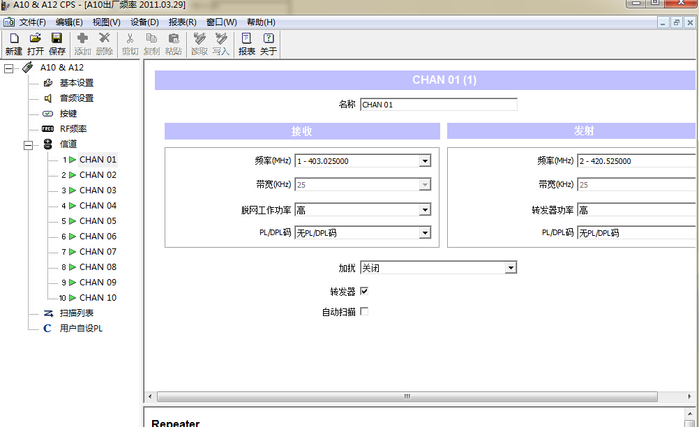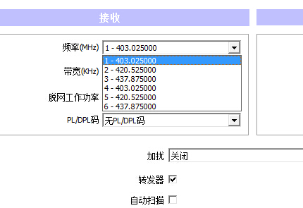 我們看到1信道界面分為左右兩個部分也就是接收和發(fā)射部分,發(fā)射部分如果為灰色不可選說明機器默認(rèn)為直頻就是接收發(fā)射為同頻并且是以接收頻率為準(zhǔn),那么當(dāng)我們使用差頻的時候需要點擊軟件界面的轉(zhuǎn)發(fā)器,如下圖:
