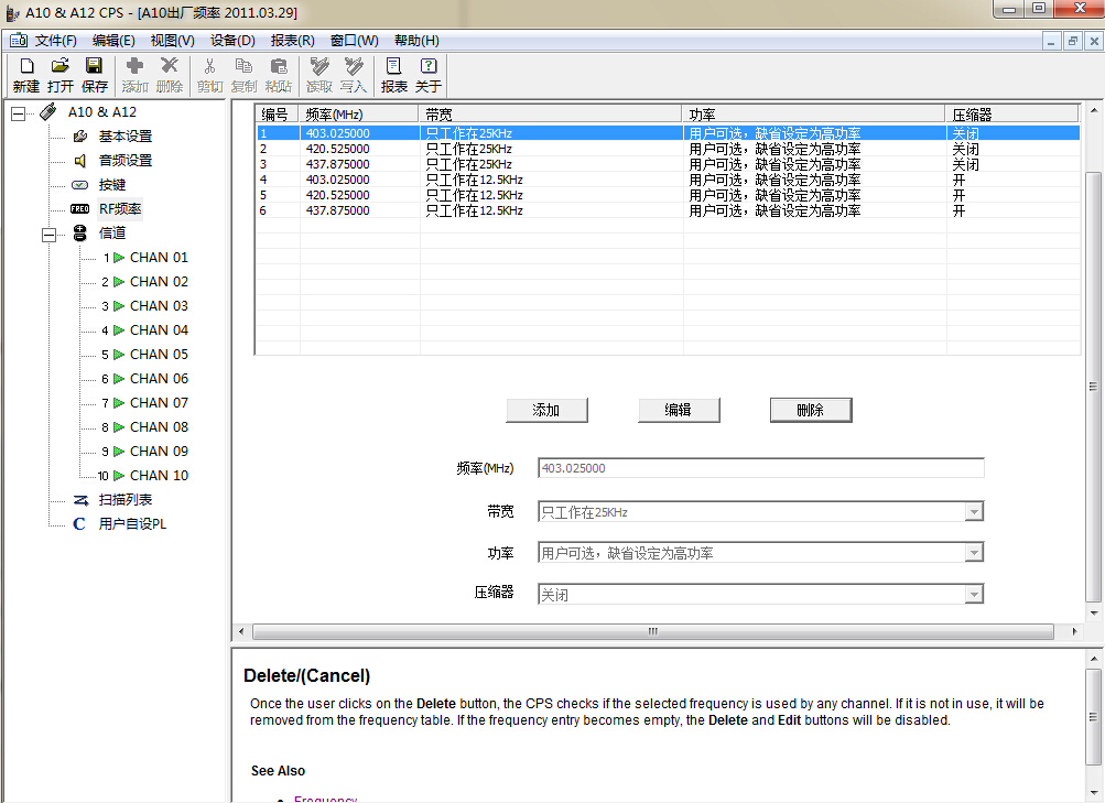 這里重點說一下摩托羅拉對講機Mag One A10/A12不同于其他對講機設(shè)置,該軟件信道界面不能直接設(shè)置機器的頻率需要在RF頻率界面提前預(yù)設(shè)如下圖
